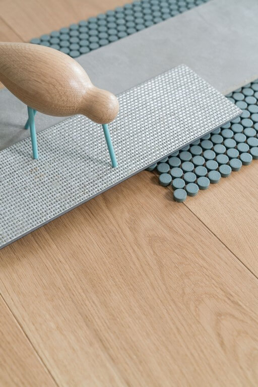 Die Parkettböden der Kollektionen Harmonia Atelier und Origin verfügen über eine traditionelle Nut-und-Feder-Verbindung und werden vollflächig verklebt. Dielenparkett kann entweder vollflächig auf dem Untergrund verklebt oder schwimmend verlegt werden, wobei in diesem Fall nur die Nut-und-Feder-Verbindungen verleimt werden. Fischgrät- und Chevronparkett werden hingegen immer vollflächig mit dem Untergrund verklebt. Die vollflächige Verklebung sorgt für eine besonders stabile Konstruktion, und der elastische Parkettkleber reduziert zudem wirksam Geh- und Raumschall. Dadurch ist das Begehen des Bodens leiser und besonders angenehm.