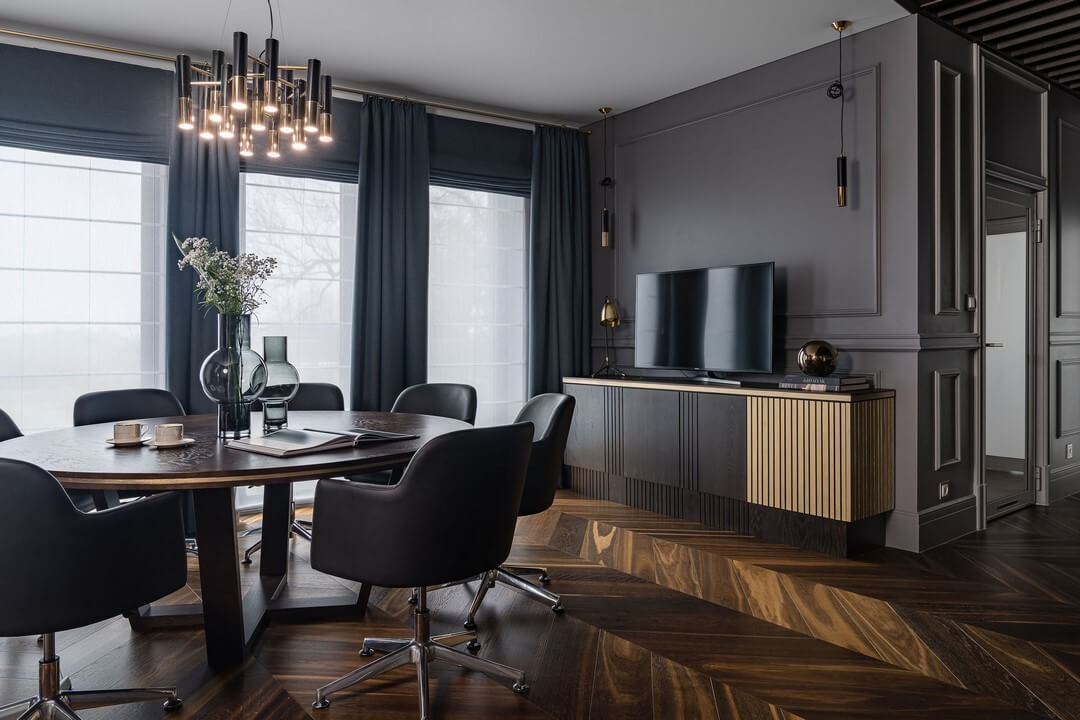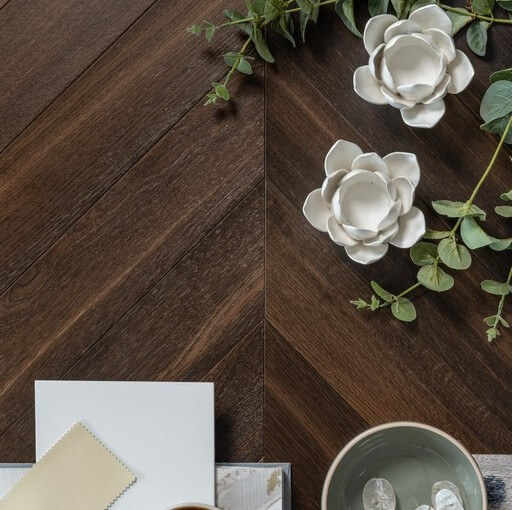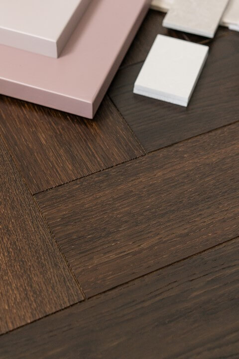 Die tiefdunkle Farbe des Schokoladeneichenbodens ist das Ergebnis eines Räuchervorgangs. Durch einen chemischen Behandlungsprozess werden die Parkettdielen über ihre gesamte Dicke hinweg sehr dunkel. Die Farbe der Eichenmaserung variiert je nach Astart. Erhältlich als Dielen-, Fischgräten- und Chevron-Parkett.