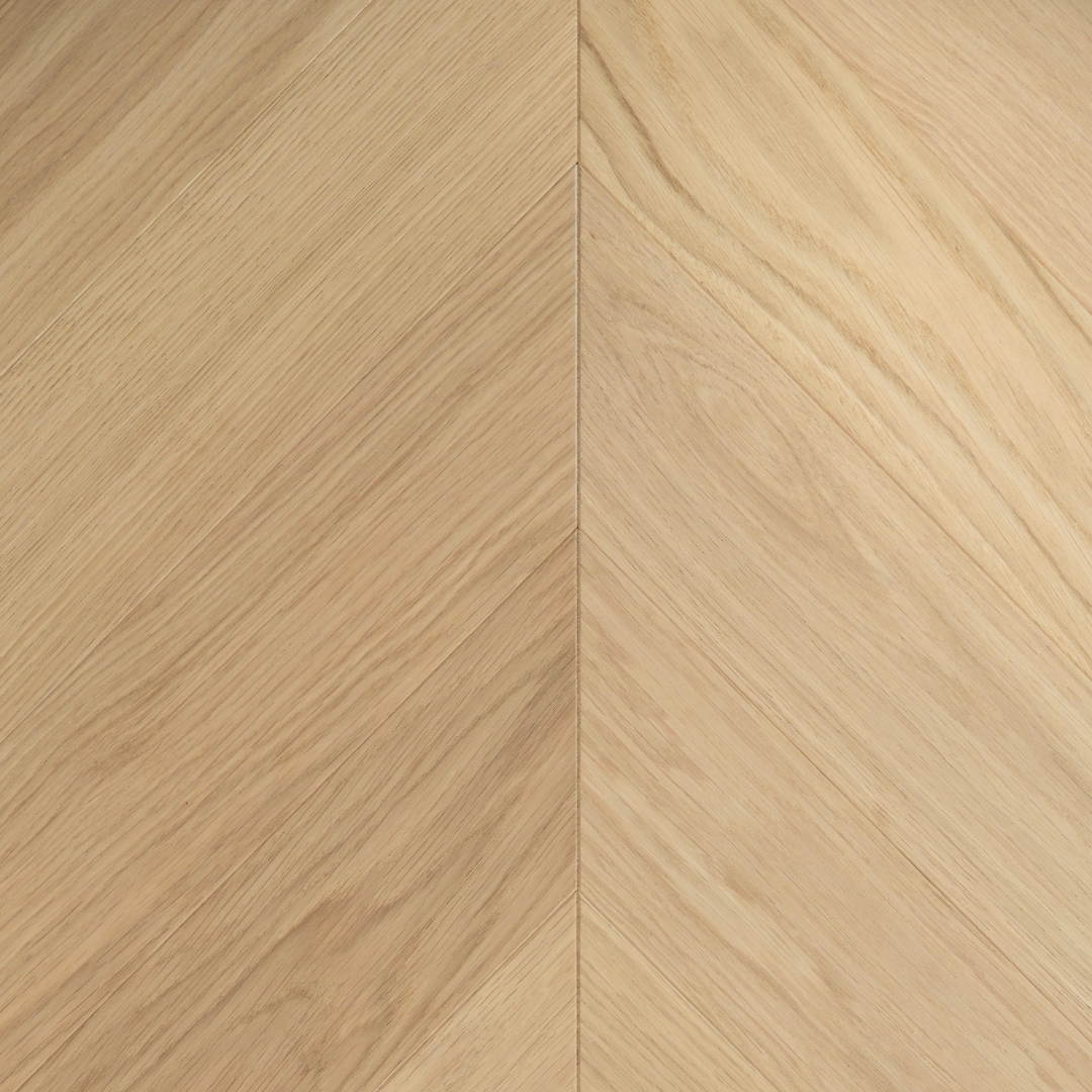 Aidosta puusta valmistettu pintakäsittelemätön ja kerrosrakenteinen Chevron parketti 4mm tammi pintaviilulla. Sävy, oksaisuus ja koko räätälöitävissä juuri sinun tarpeisiisi halusit sitten vaalean sävyisen tai tummemman sävyisen lattian.